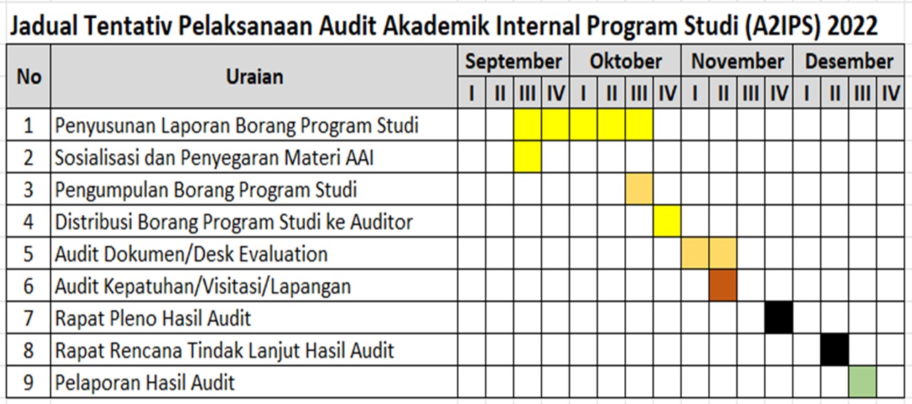 Pelaksanaan Audit Akademik Internal akan dilakukan pada minggu ke 1 dan ke 2 bulan November tahun 2022. Dimohon kepada semua program studi untuk segera menyerahkan borang dan dokumen yang akan di periksa oleh auditor kepada Pusat Penjaminan Mutu (Pusmintu).